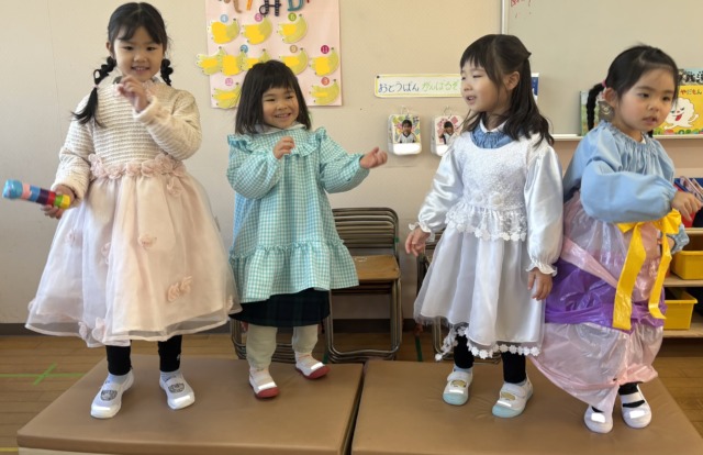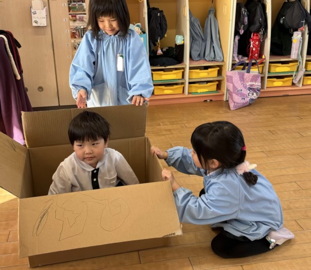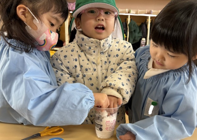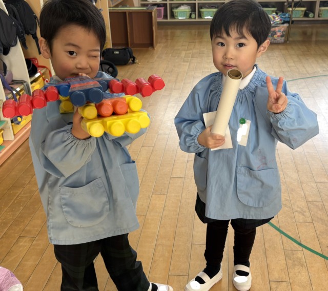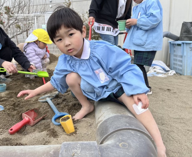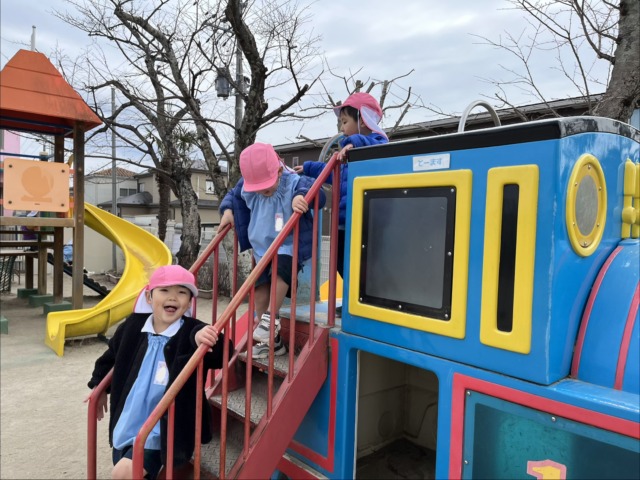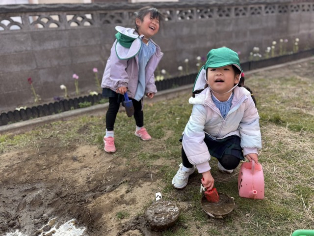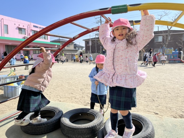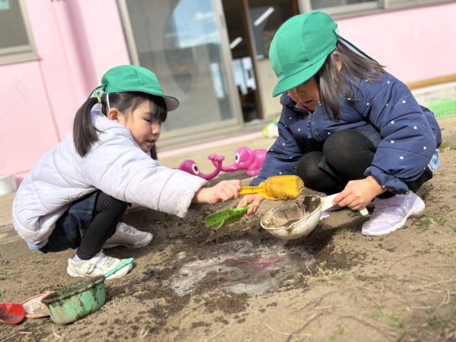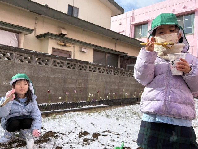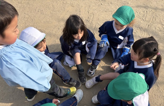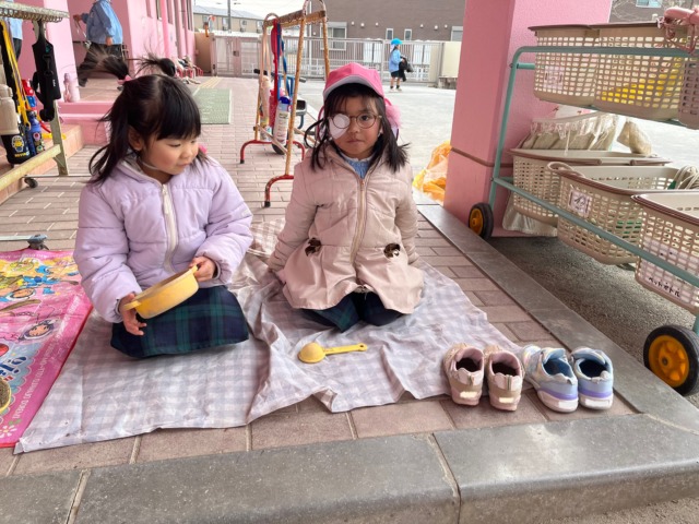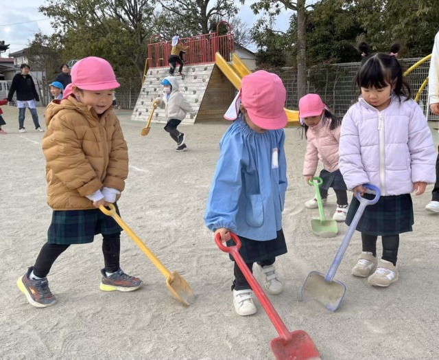今週は風が冷たい日もありましたが、お昼ご飯を食べ終わると元気がモリモリ❗️になるようで、寒さに負けずに全員で園庭へ行って遊んでいます。お家ごっこやの穴掘り工事、縄跳びなど好きなことに夢中になっています🩷食事中に「一緒に〇〇して遊ぼう!」と約束をしている声も聞こえてくるようになりました♪
