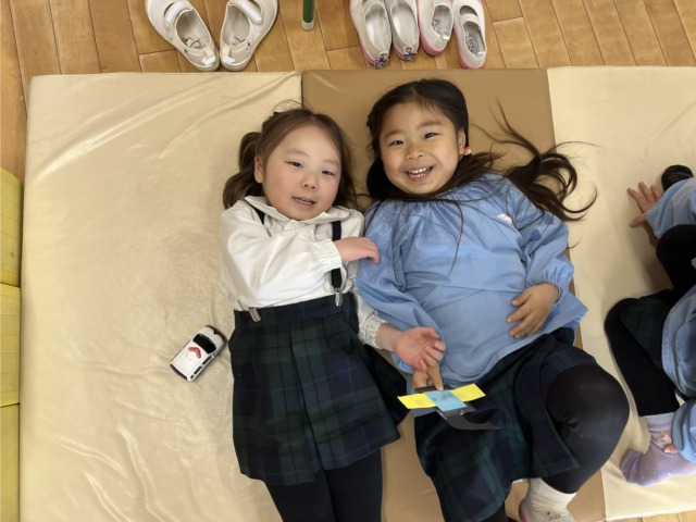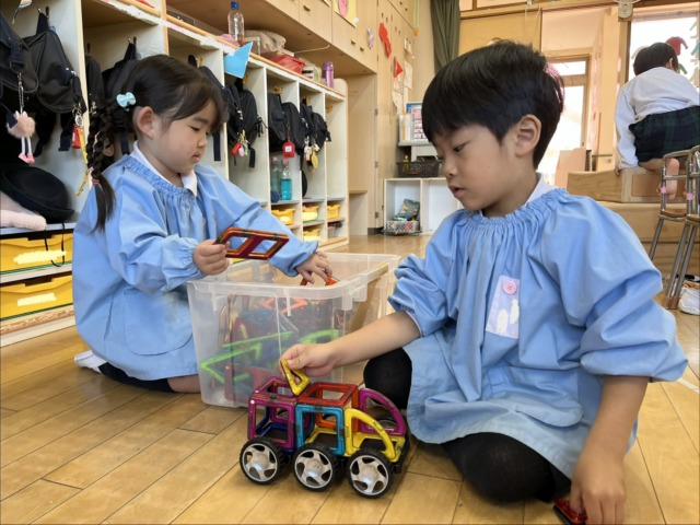 室内ではマットを敷いて寝転がったり、マグフォーマーやブロックで車を組み立てたりしながらのびのびと過ごしています♪