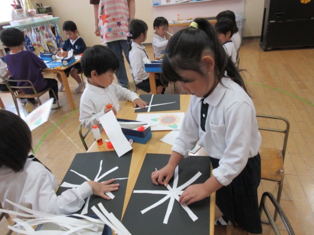 切った画用紙にのりを付けて、クモの巣を作りました。