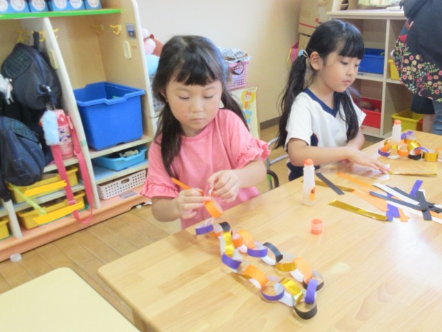 ハロウィンカラーのオレンジ色・黒色・紫色・金色の切った折り紙を輪にして輪飾り作りにもチャレンジ!