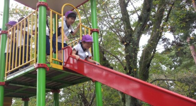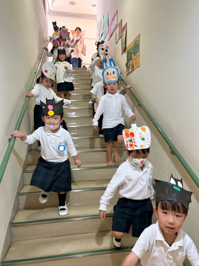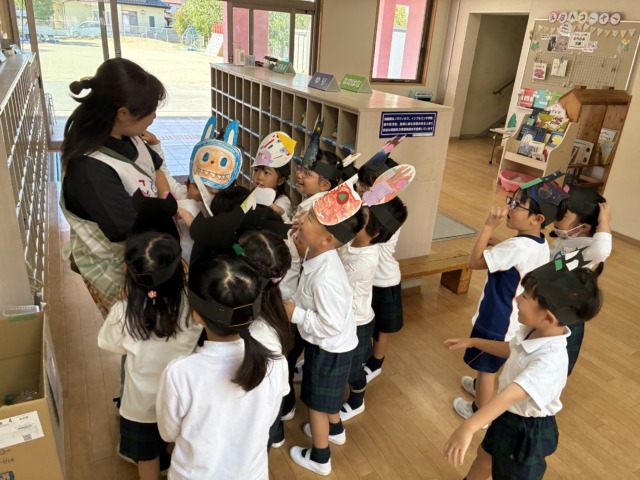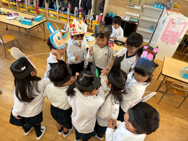 遊びの時間にはみんな自分で作ったお面を被り遊びを楽しんでいるつくし組さんです⭐︎