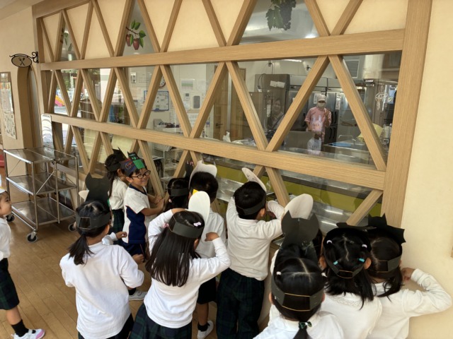 給食室の前でもガラス越しに…、『見て〜!』『おばけだぞ〜!』