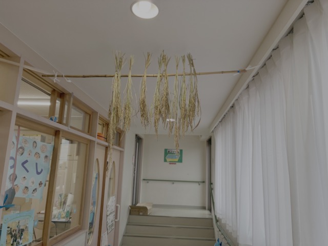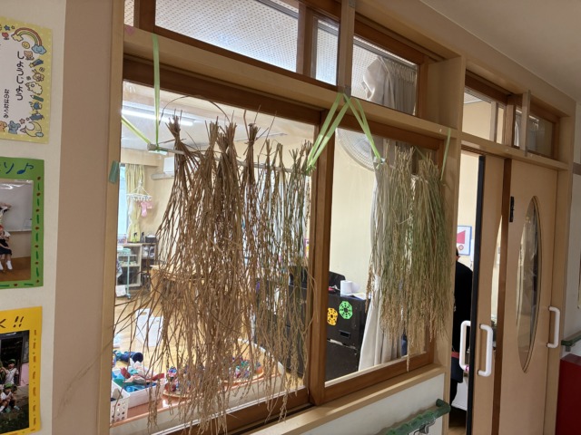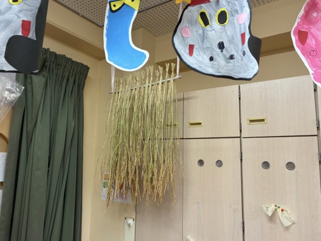 先日収穫した稲穂🌾は、各クラスで干して乾燥させています。