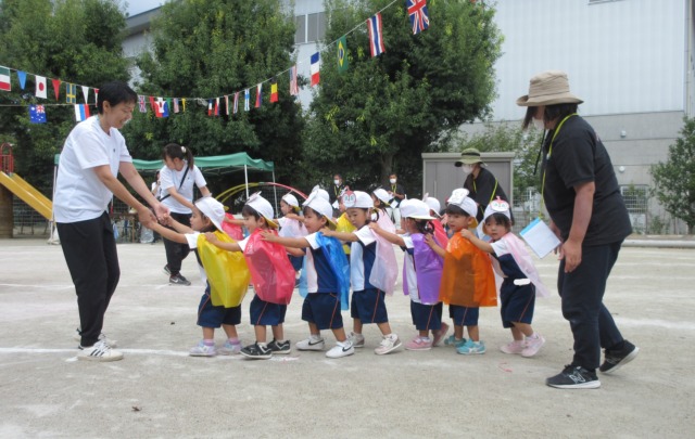 手を繋いで丸くなり、体操を楽しんでいる子ども達ですよ!