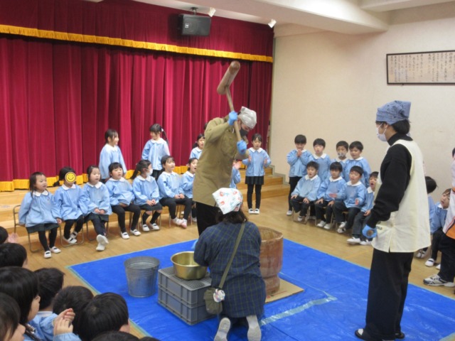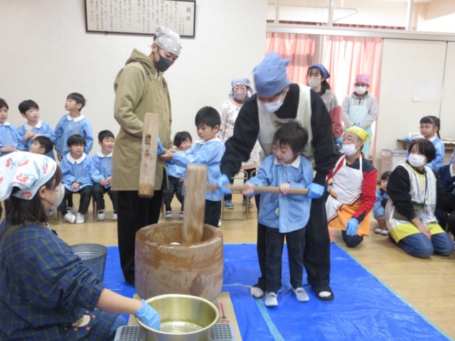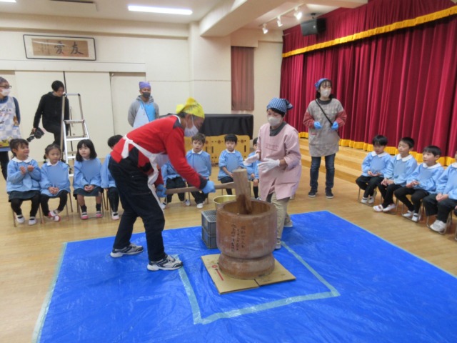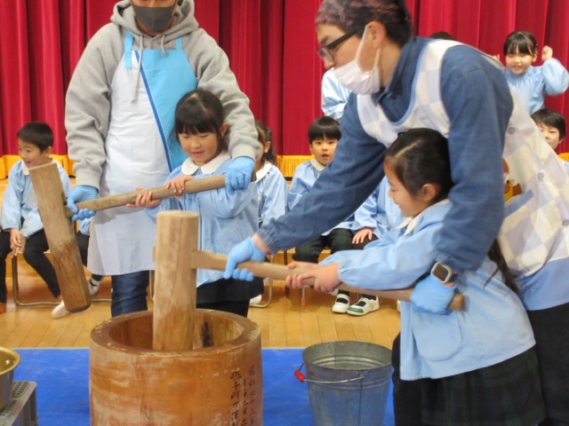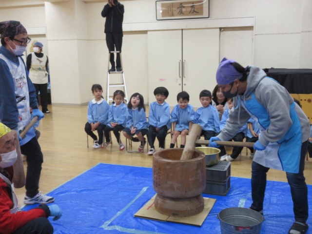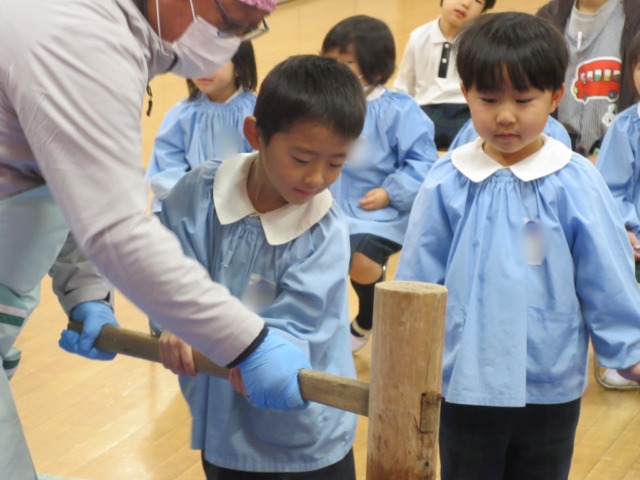 年長組の子ども達は、運転手さんやお手伝いのお父さん方の手伝いを頂きながら、1人ずつ餅をつく体験をしました!