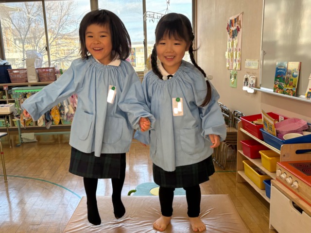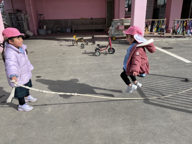 今週は久しぶりに会うお友達と、一緒に遊ぶ楽しさを味わいました!寒い日が続いていますが、園庭では鬼ごっこや縄跳びなどをして、体を動かして遊んでいます。どんなに寒くても外へ行く元気いっぱい!の年少組さんです♪
