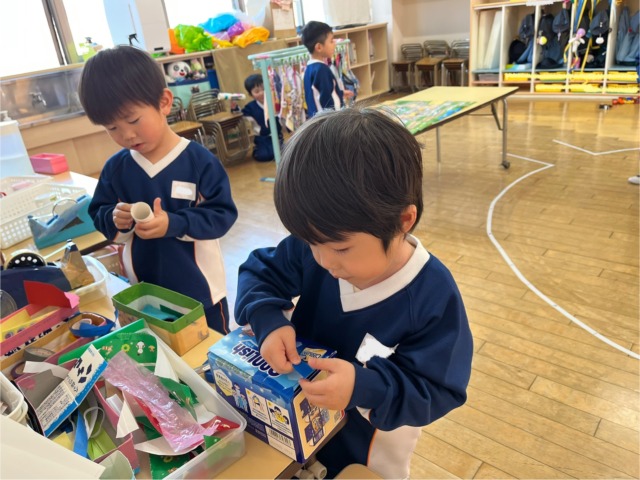 室内では工作やブロックなど、好きな遊びを見つけて楽しんでいます。お友達に「まぜて🩷」「一緒に遊ぼう‼️」と言って誘い合っていますよ。