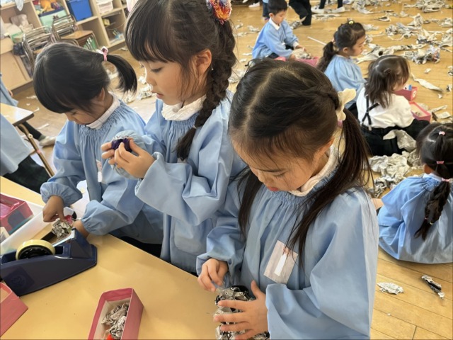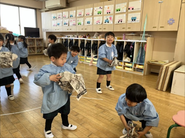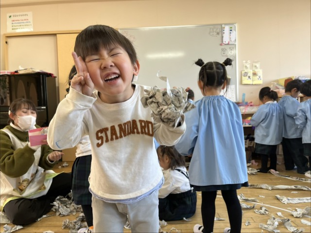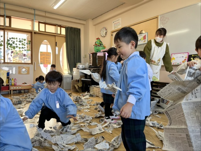一枚の大きな新聞紙をビリビリと破いて、大喜び!細かくなった新聞紙が豆に変身しました。みんなそれぞれに大きい豆や小さい豆になりましたよ♪これで鬼を追い払おうね‼️