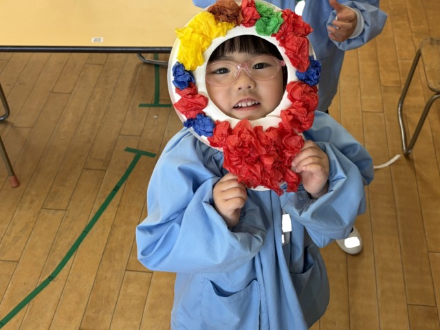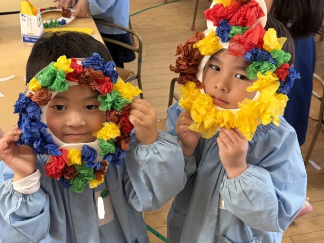 1つの色を沢山つけたり、いろんな色を使ってカラフルにしたりなど様々な鬼のお面ができました。