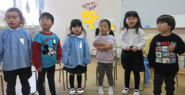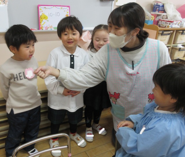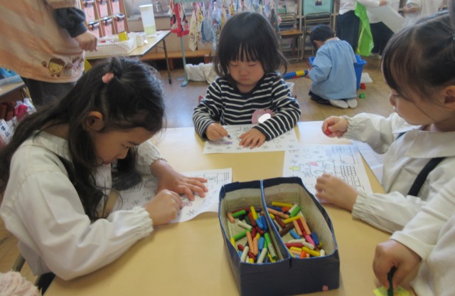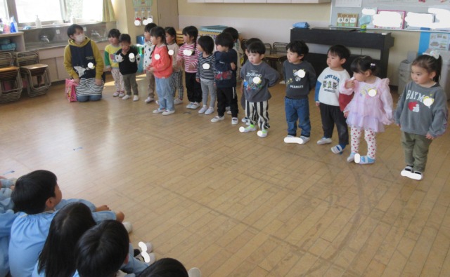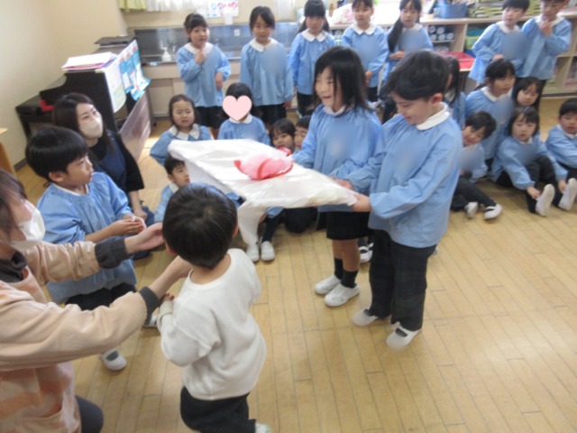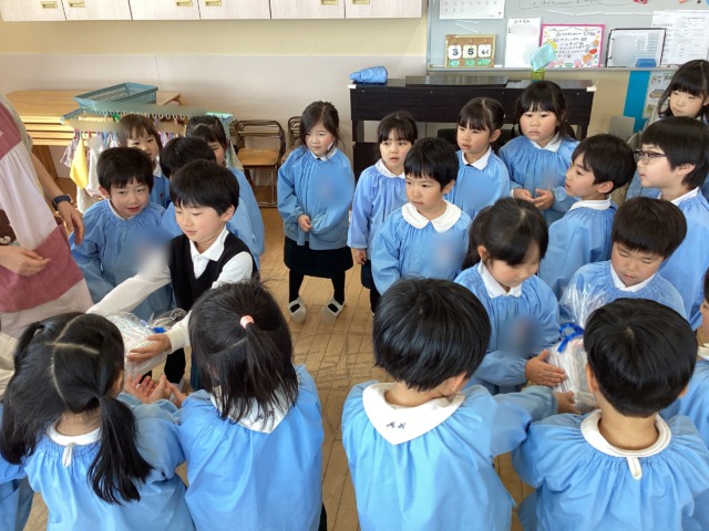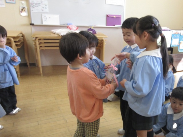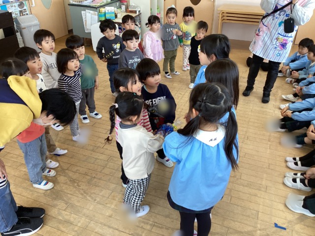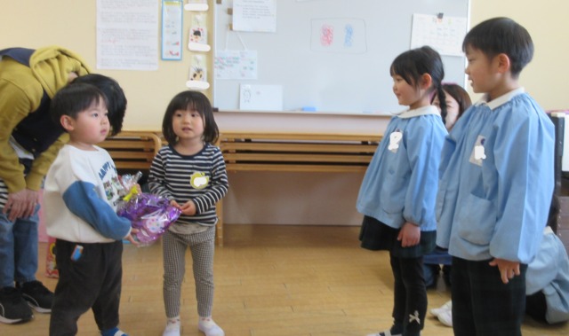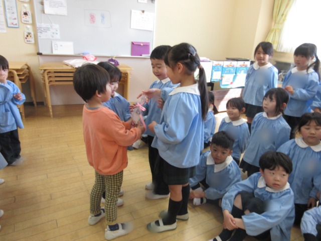 3月5日(木) もう少しで卒園する年長組さん。沢山遊んでくれたり、優しくしてくれたお兄さんお姉さんに、みんなで好きな絵を書いて作った「ガーランドのプレゼント」を渡しに行きました🌟