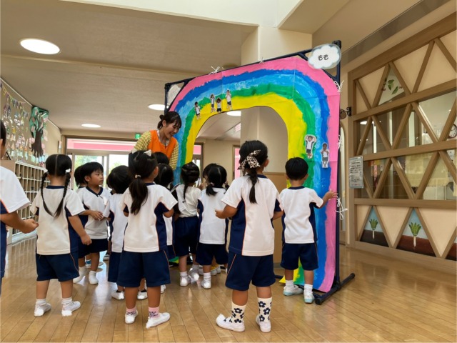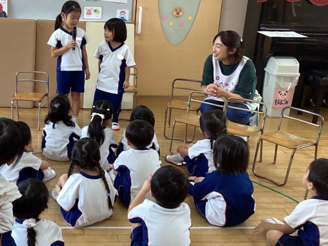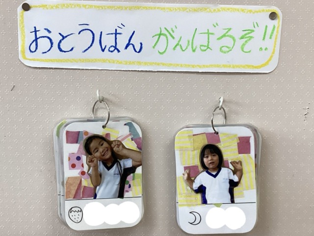 毎日2人のお当番さん。カードがあることで、今日は自分の番‼️明日は〇〇ちゃんだね‼️と楽しみにしているもも組さんです。朝の集まりで、みんなの前で行うインタビューはドキドキするようですが、小さな声で答えてくれていますよ♪