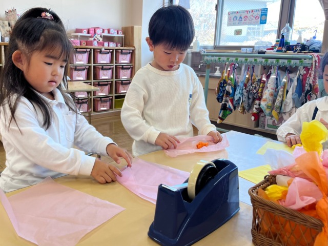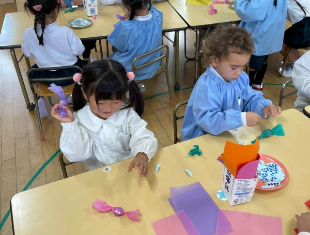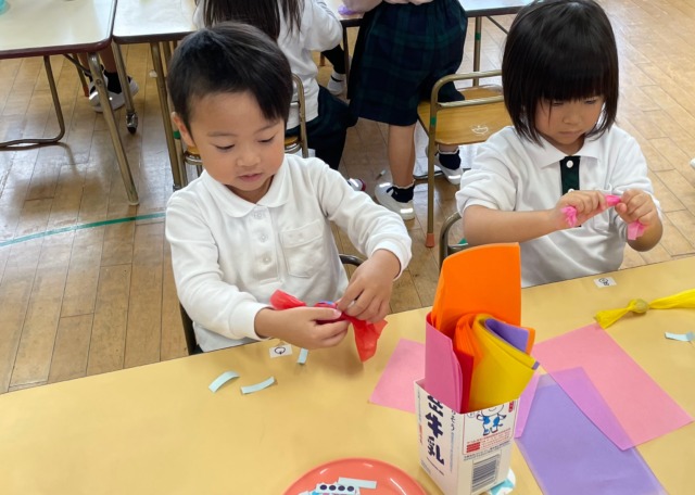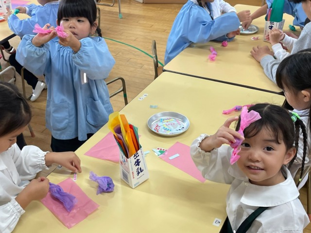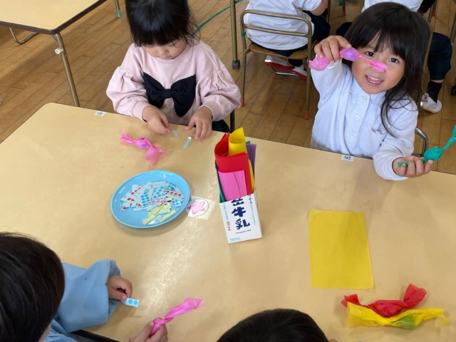 花紙を丸めて、それを包んでシールを貼り、可愛く飾り付けをして美味しそうな飴が沢山できました🌟