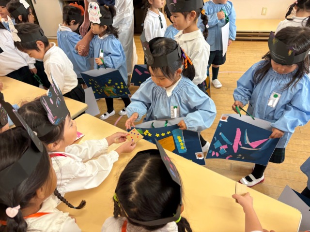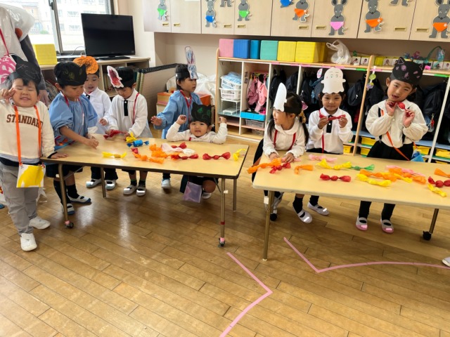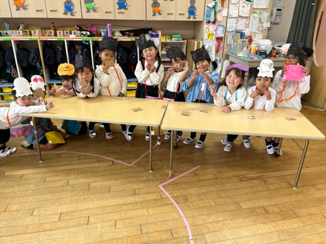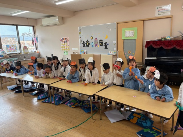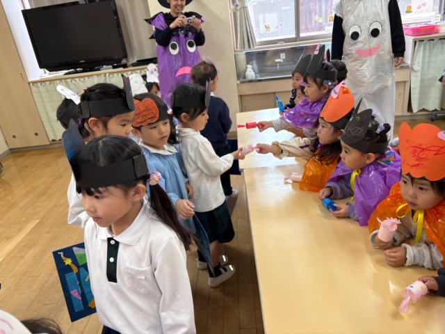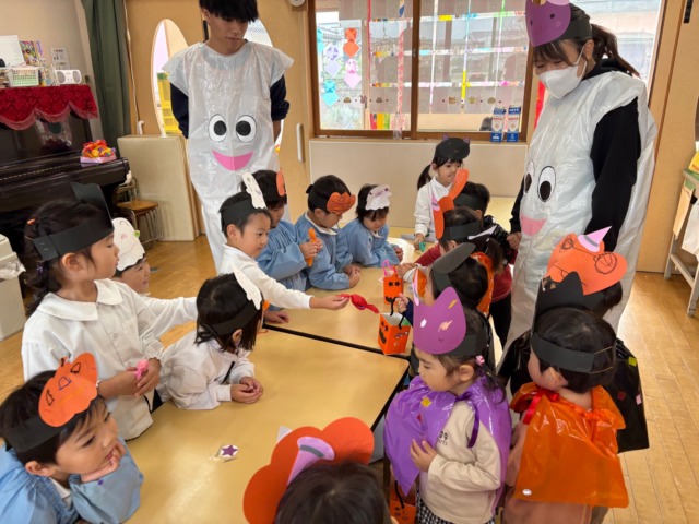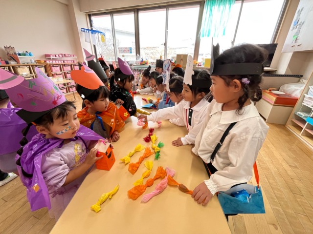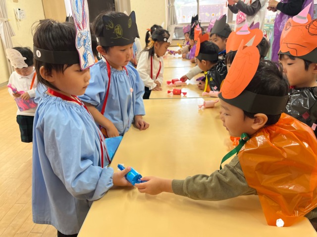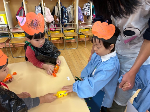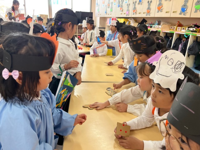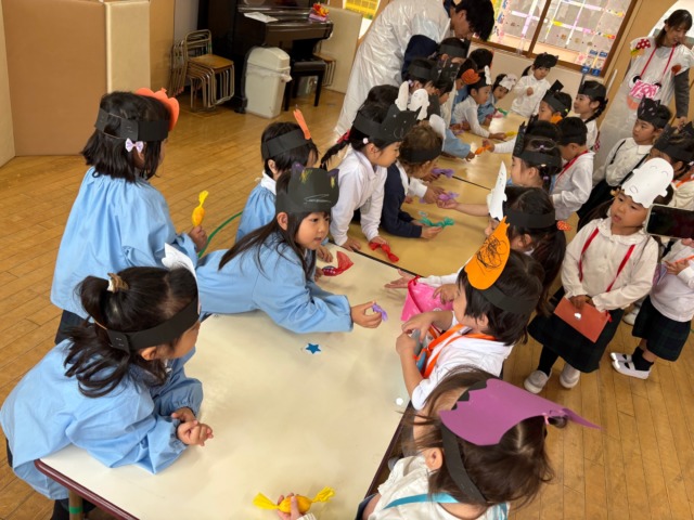 各クラス、お面をつけたり、カバンやマントをつけたりして黒猫やカボチャ、おばけなどに変身しました⭐︎「ハッピーハロウィン!」「トリックオワトリート!お菓子をくれないといたずらしちゃうぞ!」と各クラス回りお菓子の交換をし、とても楽しい交流になりました🎵