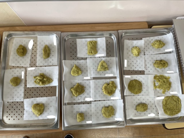 ハートやくるま、三角、大きな丸など、それぞれ自分の好きな形に出来上がりました!最後は、給食屋さんに美味しく焼いてもらったら…ついに完成です✨