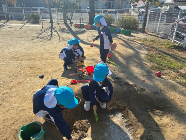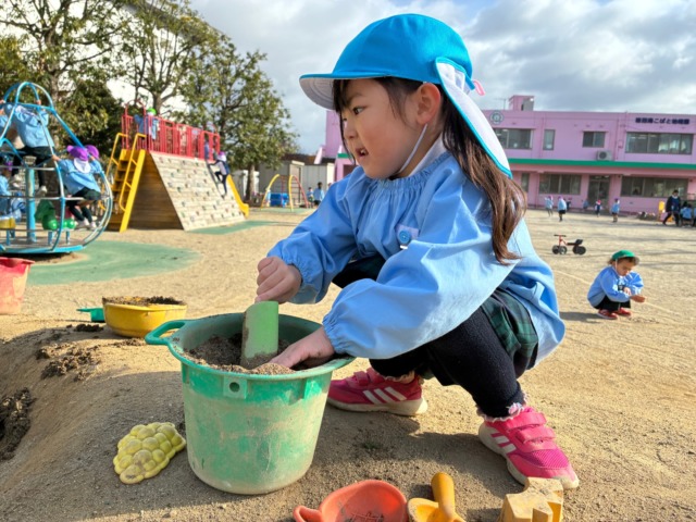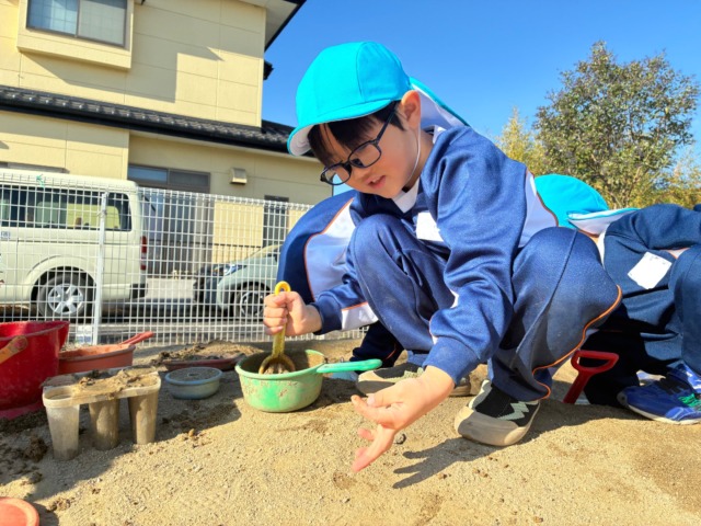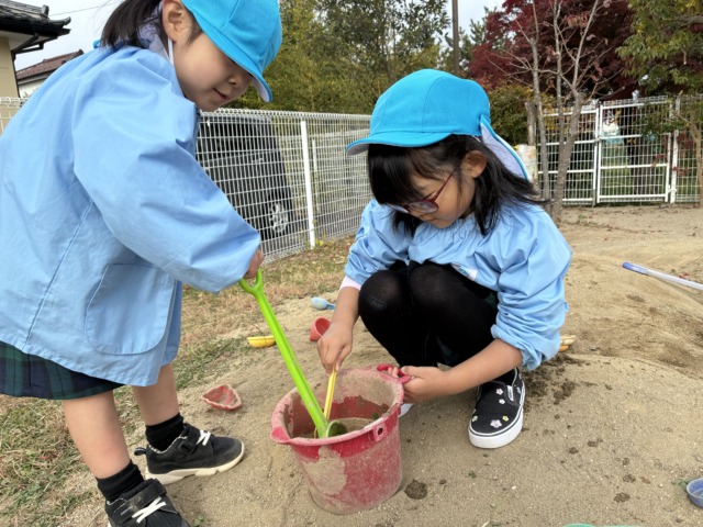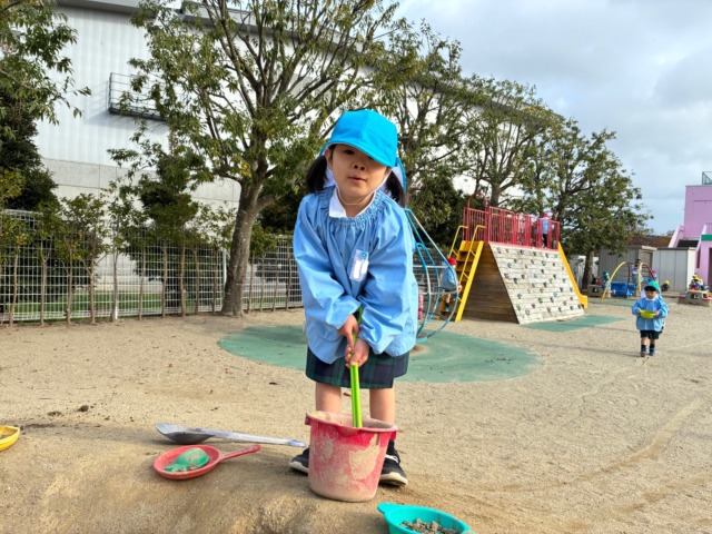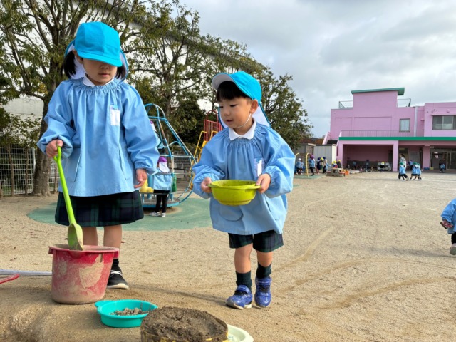 先週から子ども達が夢中になって遊んでいるのが、園庭の山⛰️の土を使ってのチョコレート作りです!(泥んこ遊び)