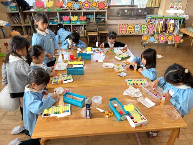 室内では、マーカーで形を描き、その上にのりをのせて、固まるまでしばらく待つと…。
