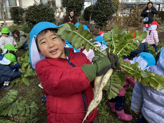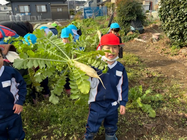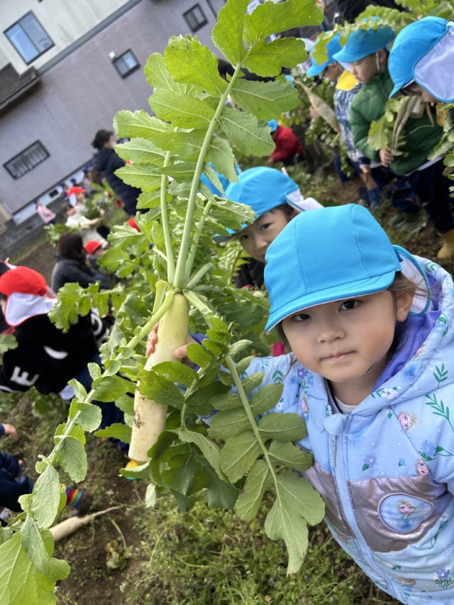 自分で収穫した大根は お土産に1人一本持ち帰りました😊次の日、持ち帰った大根をお家で食べたことを教えてくれる子が沢山いました。「お味噌汁にしてもらった!」「サラダおいしかったよ✨」と、嬉しそうにお話ししていましたよ♪