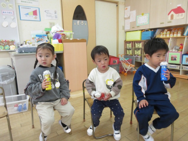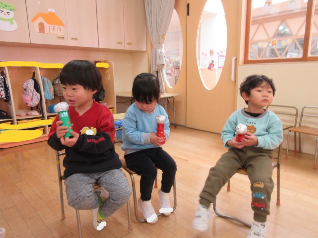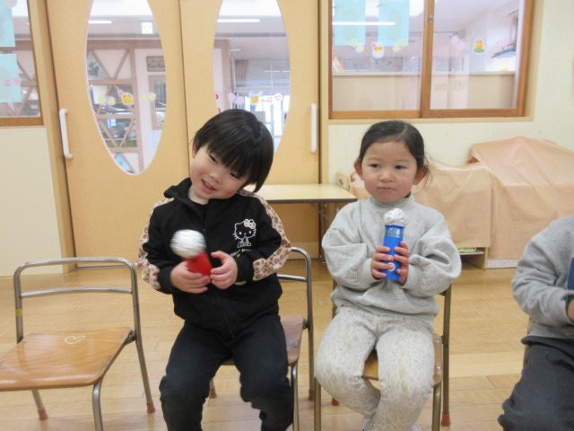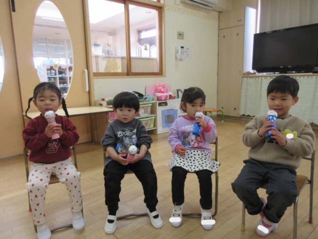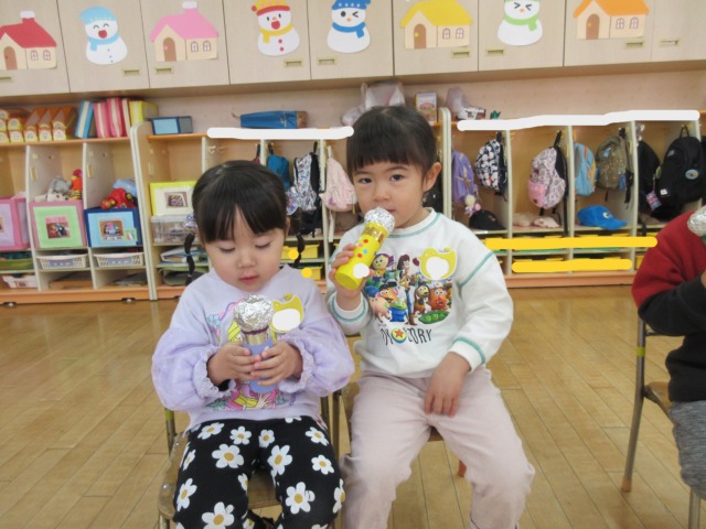 先日製作したmyマイクを使って自分の名前を話したり、みんなで歌をうたって楽しんでいます🎤
