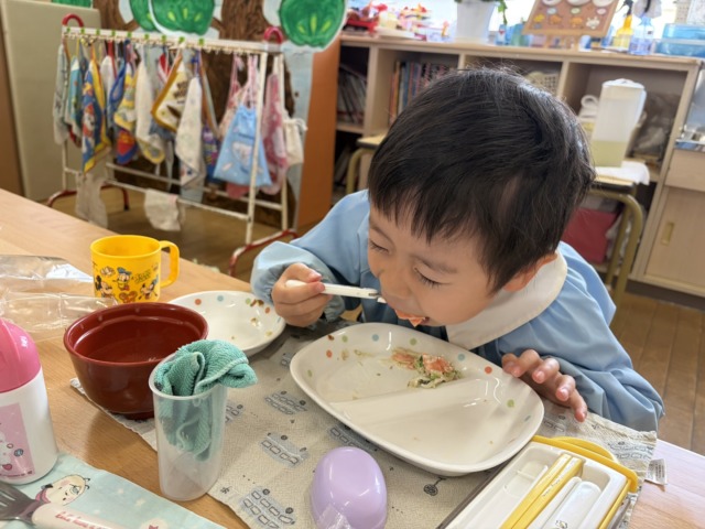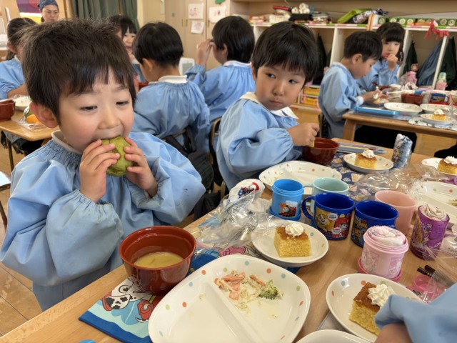 お別れ会当日!この日の給食は、年長さんがリクエストした特別メニューでした✨唐揚げやケーキなど、子ども達の大好きなものばかりで、みんな大満足な様子でした😋