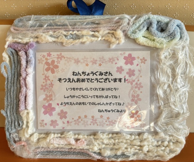 厚紙に様々な色合いの毛糸🧶を貼り付けてフワフワのかわいいフォトフレームを作りました!