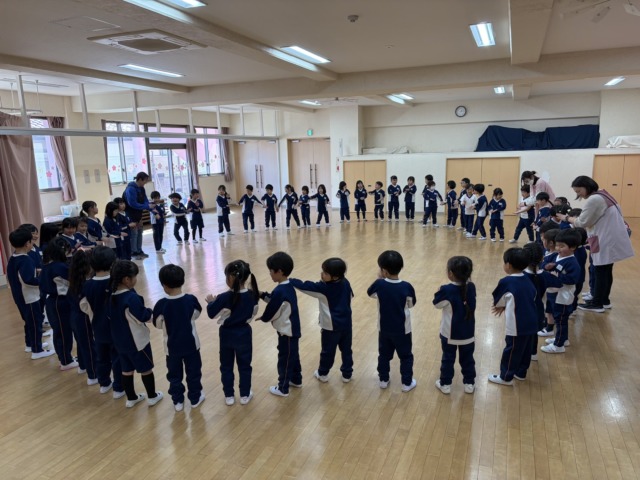みんなで大きな輪になって、手を繋いだりタッチをしたり…お友達と息を合わせて楽しんでいました😊