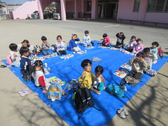そして…ひよこ組最後のお弁当の日。園庭にブルーシートを敷いて、ピクニックをしました。外で食べるお弁当は、とても美味しかったようですよ。